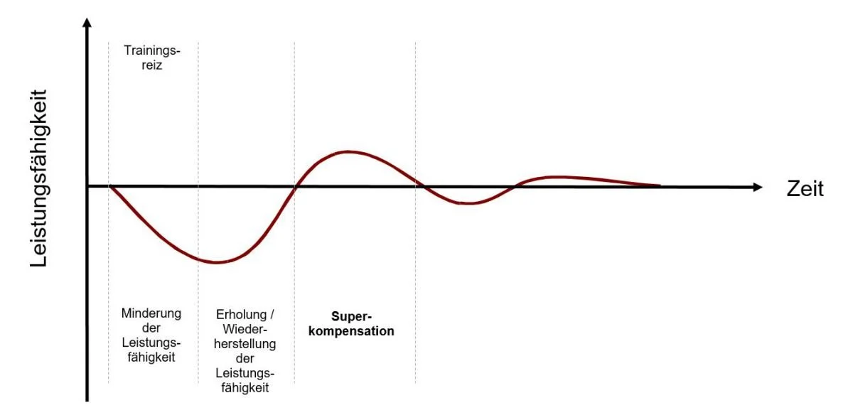Merke: Nach der kurzfristigen Abnahme der Leistungsfähigkeit direkt nach dem Training, kommt es bald zu einem Anstieg der sportlichen Leistung, über das Ausgangsniveau hinaus.